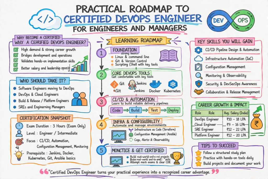 Certified DevOps Engineer is a strong choice for professionals who want a practical, role-based DevOps credential rather than a theory-only certificate. Its official focus on CI/CD, automation, configuration management, and monitoring makes it relevant to real delivery work in modern software teams. For engineers, it can create stronger direction and role clarity. For managers, it can help define what practical DevOps capability should look like. And for long-term growth, it works well as a starting point before moving deeper into DevOps or branching into DevSecOps, SRE, AIOps, MLOps, DataOps, and FinOps paths.